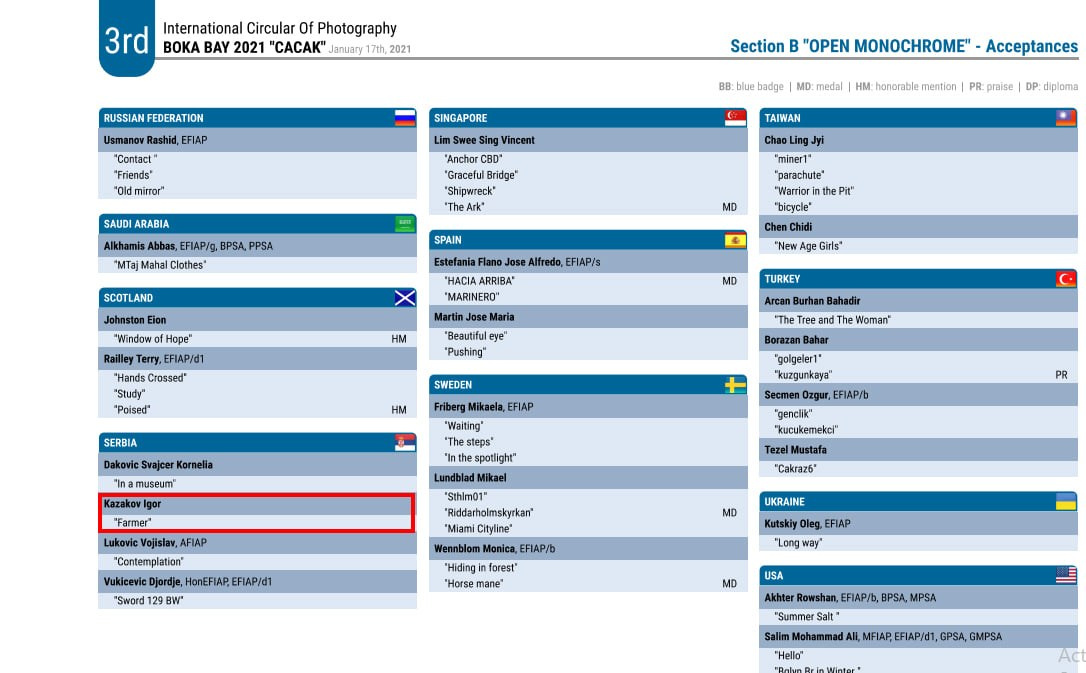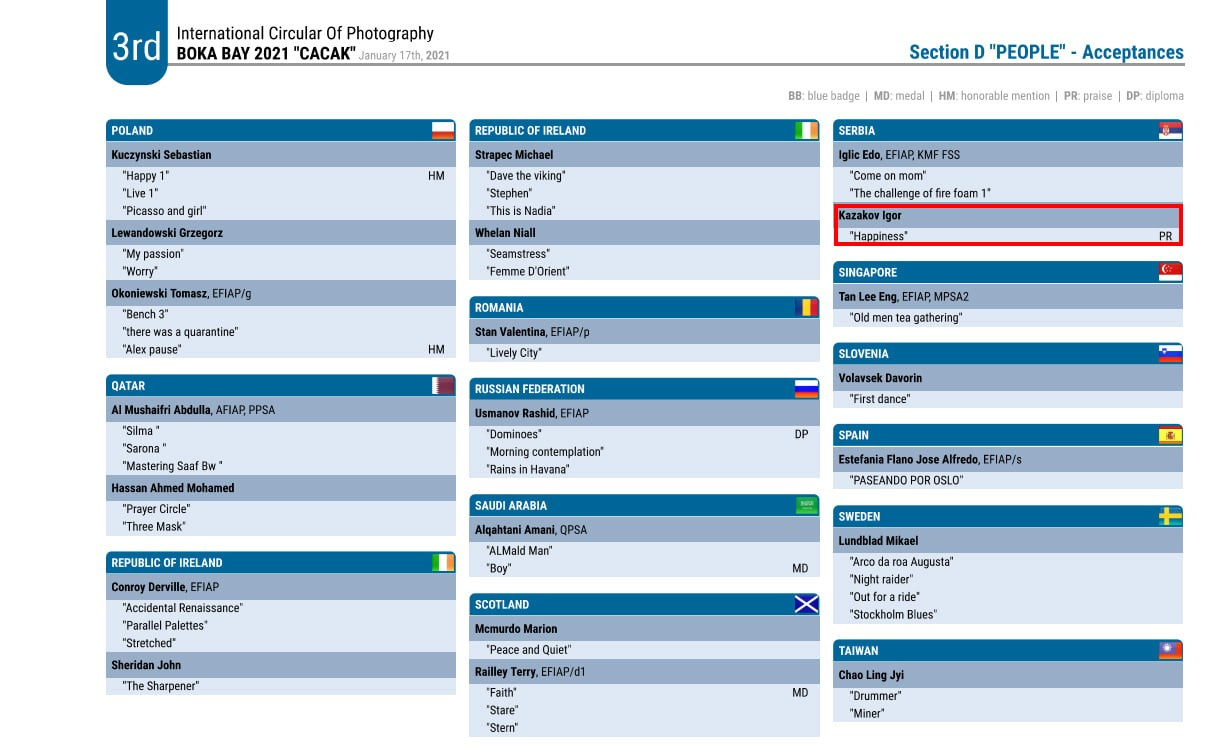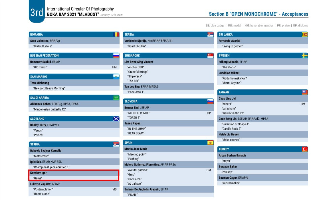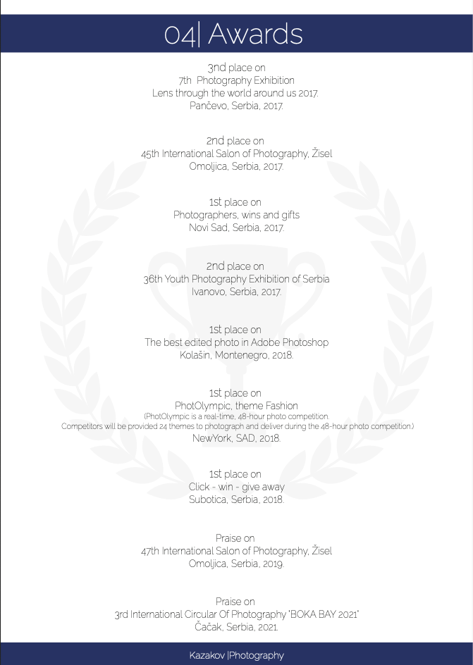 Neke od mojih fotografija su više puta nagrađivane na internacionalnim salonima umetničke fotografije, a među njima mi je posebno drago osvojeno prvo mesto u Njujorku na takmičenju posvećenom modnoj fotografiji (2018.god)