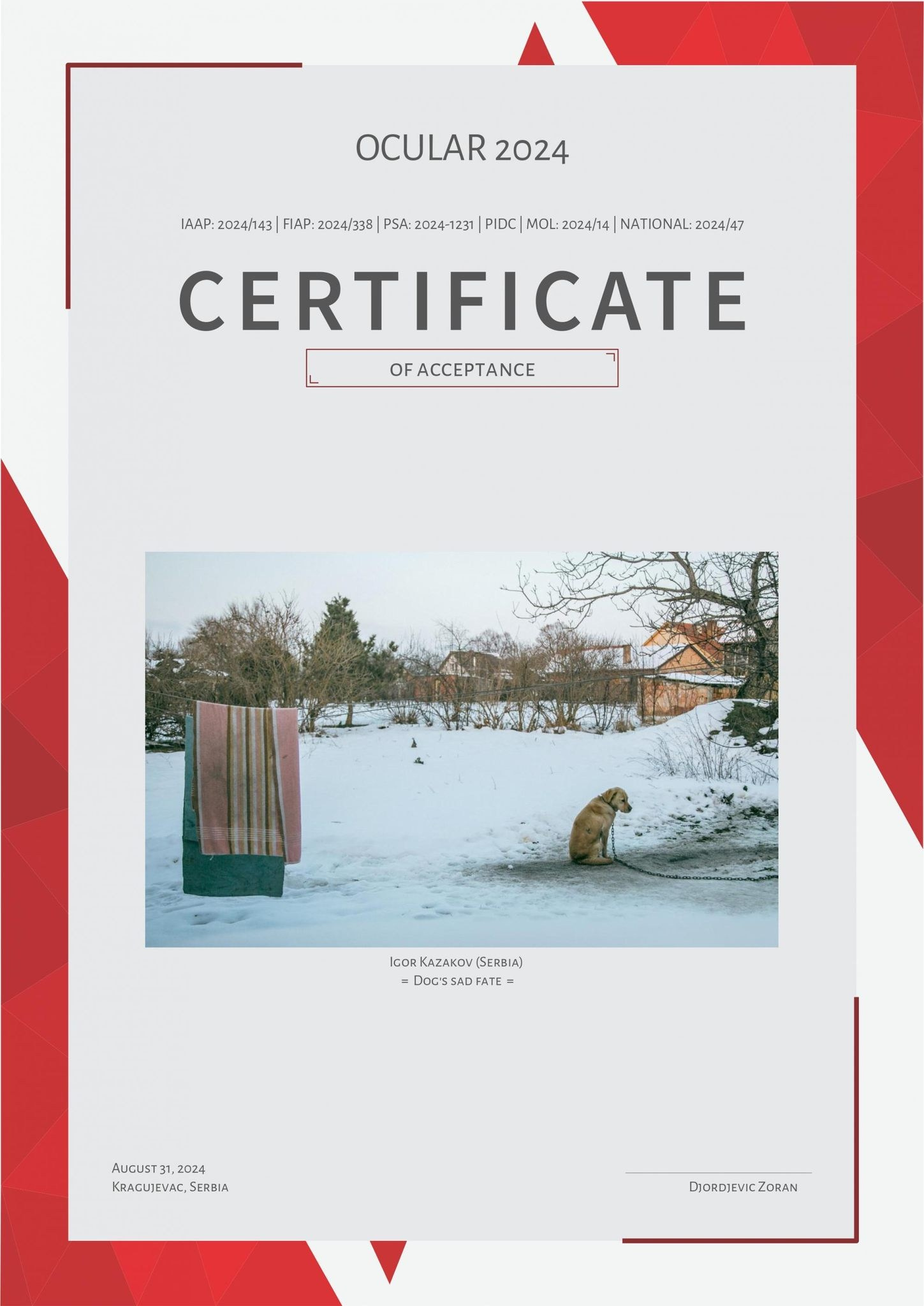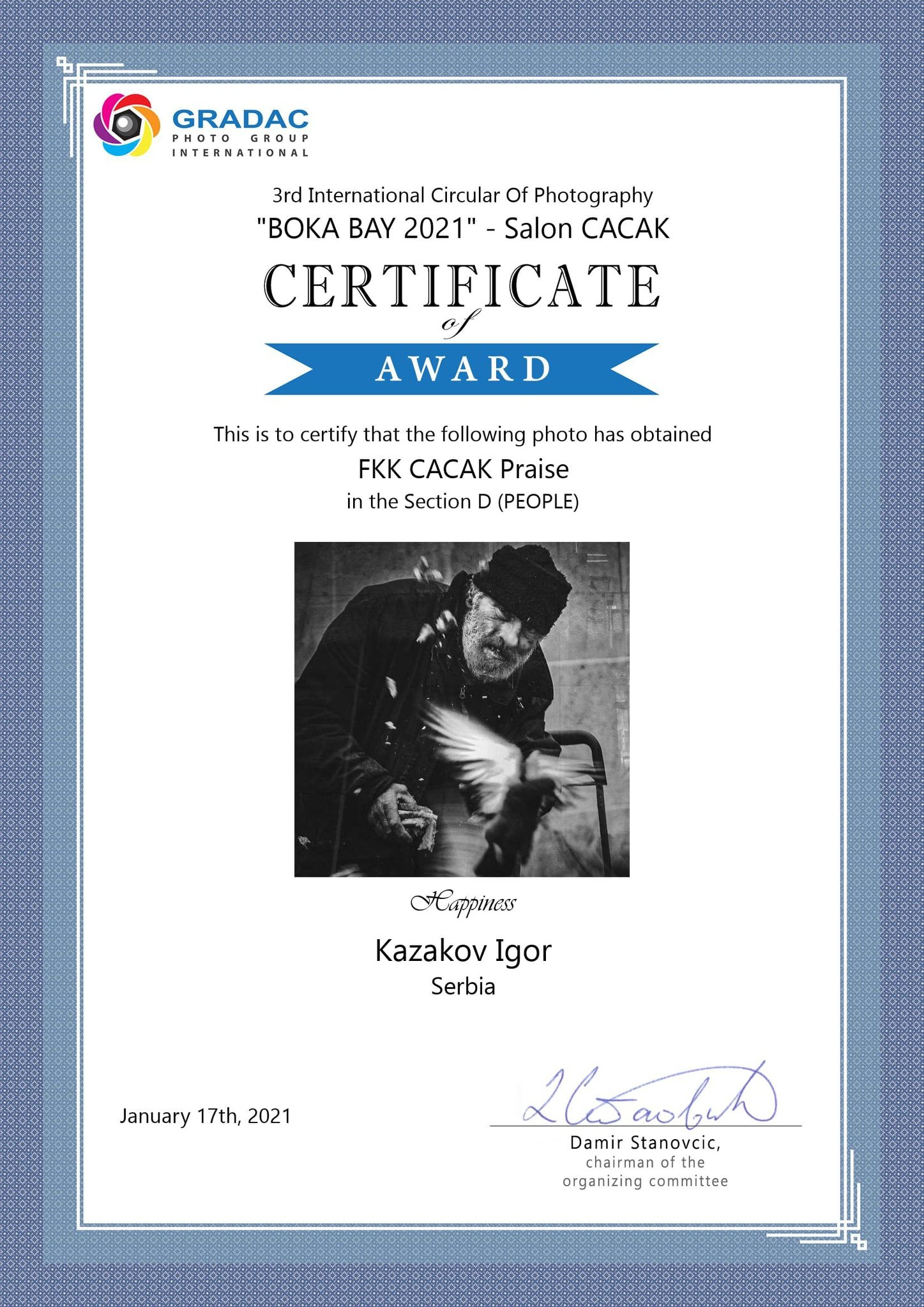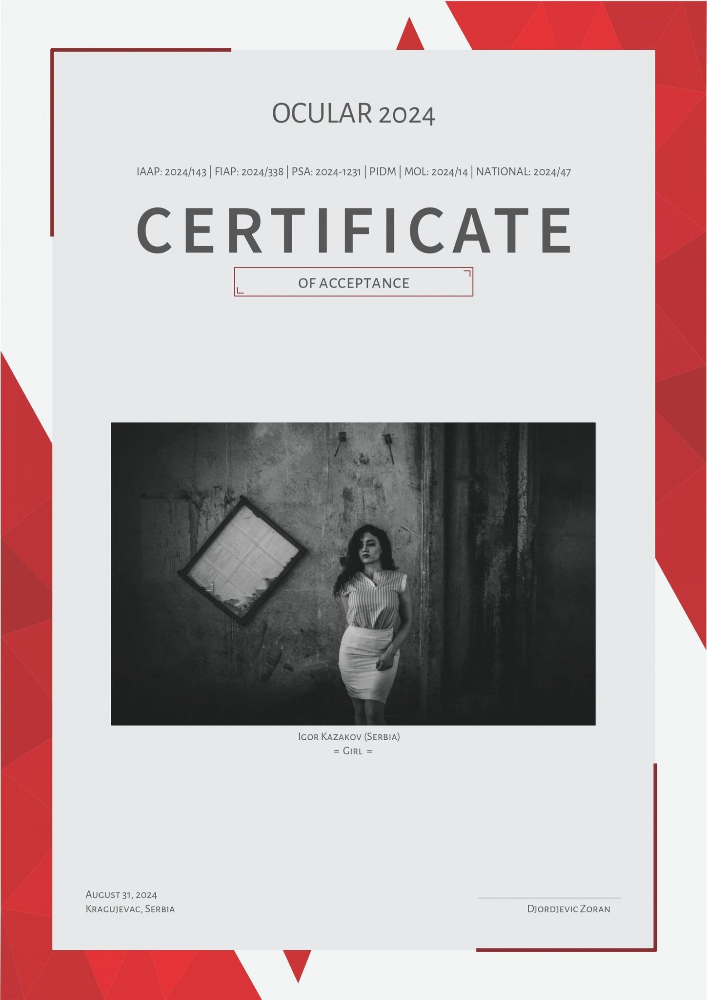 Neke od mojih fotografija su više puta nagrađivane na internacionalnim salonima umetničke fotografije, a među njima mi je posebno drago osvojeno prvo mesto u Njujorku na takmičenju posvećenom modnoj fotografiji (2018.god)